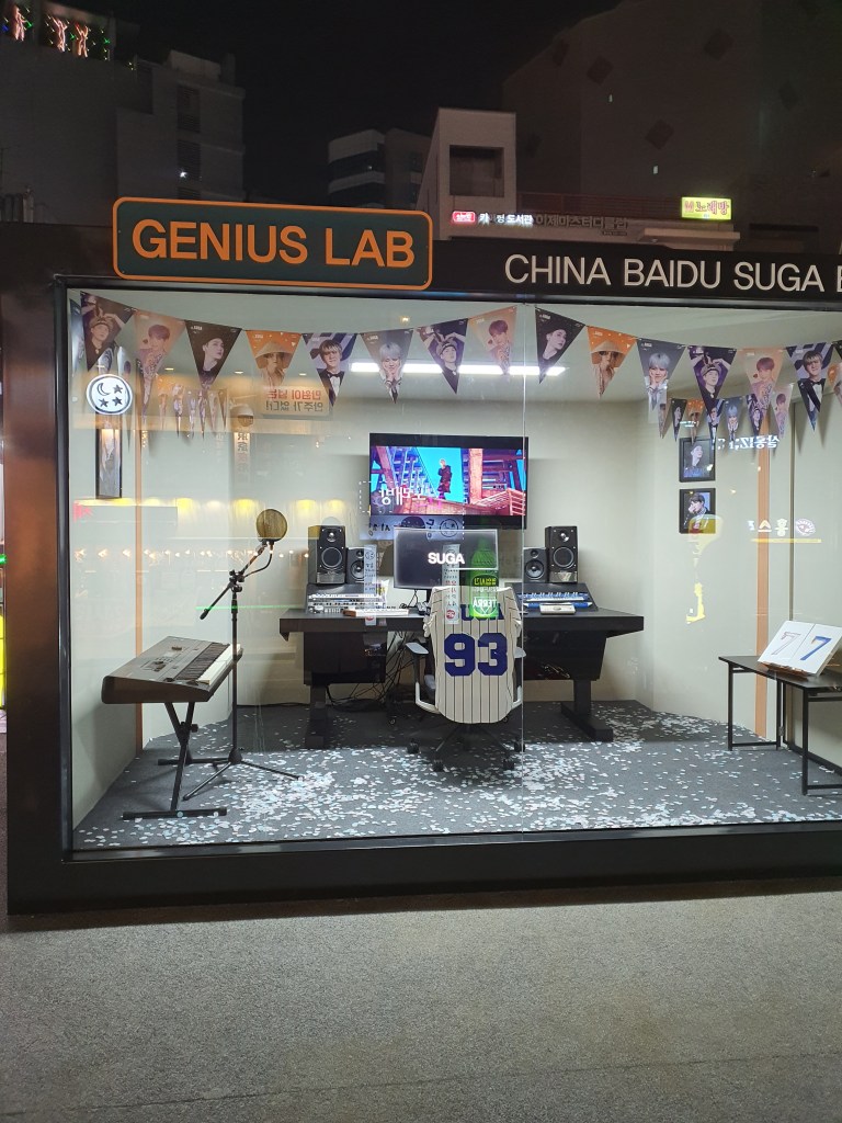 Τέλος, εκείνη την ημέρα ήταν κοντά στα γενέθλια του SUGA των BTS και η φίλη που βγήκαμε είναι μεγάλη φαν, οπότε περάσαμε από το μέρος όπου το κινέζικο φαν κλαμπ είχε στήσει μια αναπαράσταση του studio του SUGA λόγω γενεθλίων και ήταν κάπως έτσι