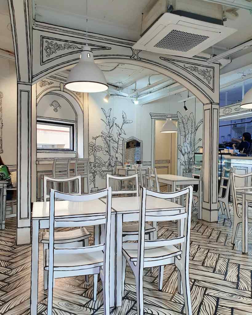 όπως βλέπετε, το εσωτερικό είναι όντως σαν ζωγραφιά. Το καφέ βρίσκεται στην Hongdae, μπορείτε να πάτε είτε με λεωφορείο ή αν είστε της άσκησης, από τον σταθμό του μετρό είναι 20 λεπτά περπάτημα.