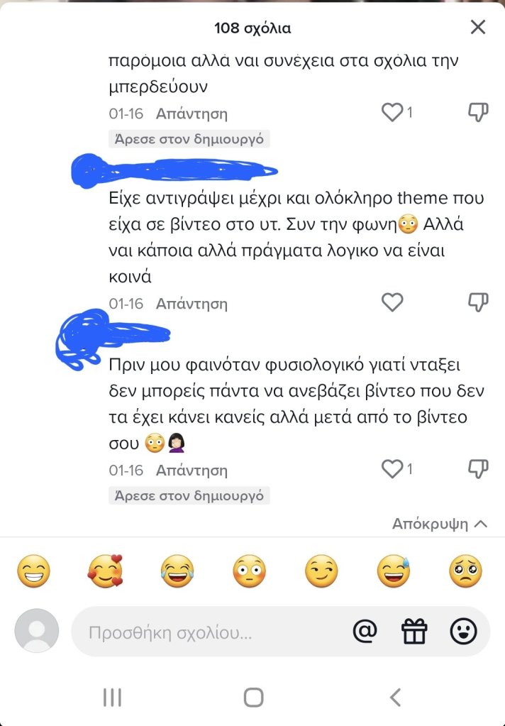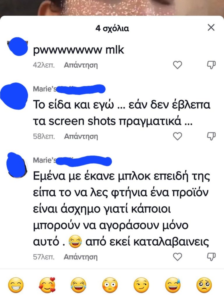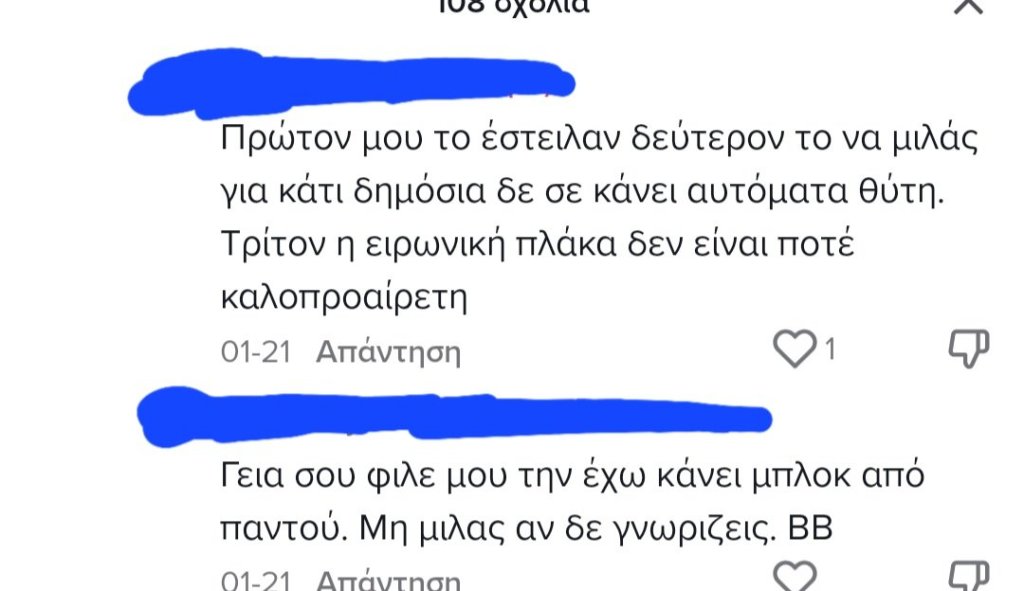 Φτάνουμε στο σήμερα! Σήμερα λοιπόν βγαίνει η συγκεκριμένη το παίζει θύμα, ότι εγώ κάνω βίντεο για αυτήν (που την έχω μπλοκ στο τικτοκ δεν ξέρω καν τι ανεβαζει) δημόσια μιλάει άσχημα για εμένα και λέει πως την αντέγραψα, την είπα φθηνή(;!) Και ότι ήμασταν πολύ κοντά και μιλούσαμε πάρα πολύ. Κατά την δική μου γνώμη όταν μιλάς με ενα άτομο για να λυθεί μια παρεξήγηση (που δεν την δημιούργησα καν εγω) για 3 μέρες…ούτε πολύ κοντά το λες ούτε φίλες το λες. Όταν μου έστειλαν το βίντεο είχα μείνει με το στόμα ανοιχτό! Πως είναι δυνατόν να μην σε έχω ενοχλήσει ποτε και αντιθέτως να ψάχνεις κάθε ευκαιρία να το κάνεις σε εμένα.