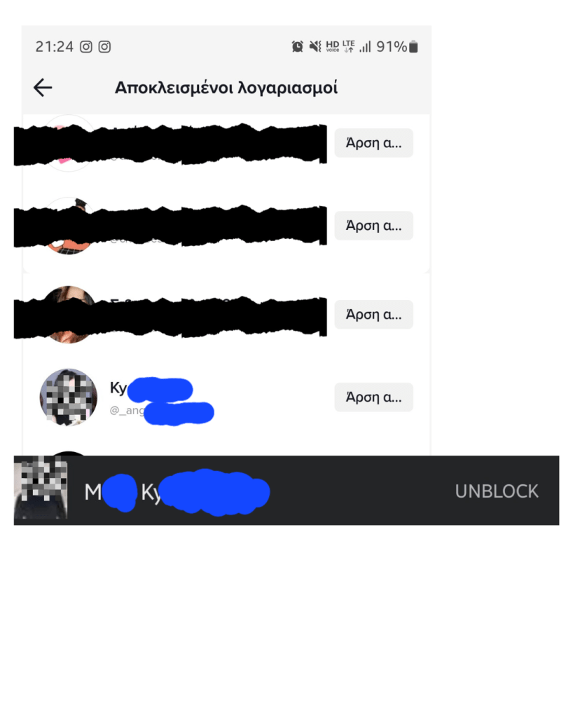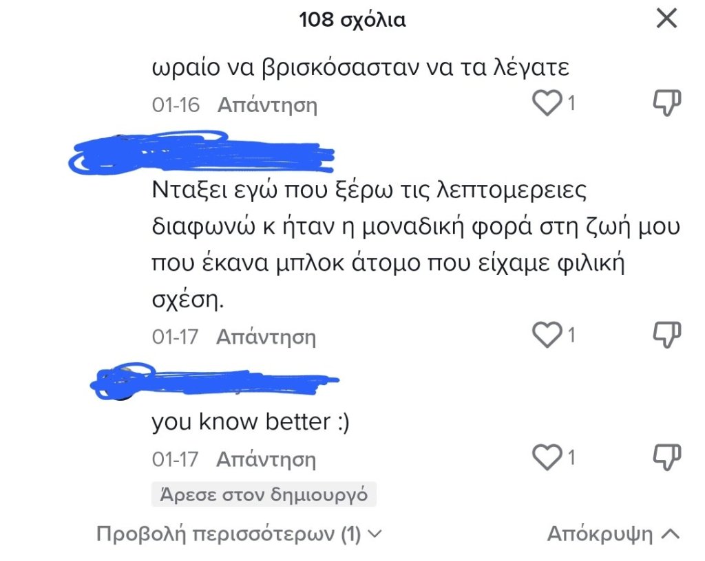 Τέλος πάντων την έκανα block από ο,τι άλλο υπήρχε (facebook, tiktok μεχρι και restrict στο youtube) γιατί δεν ήθελα να βλέπει τι κάνω εφόσον και αυτή επέλεξε να μην έχει σχέση μαζί μου και η αλήθεια είναι ότι δεν έβλεπα και τα βίντεο της γιατί δεν μου άρεσαν σαν content (δεν με ενδιαφέρει να σε δω να κάνεις μακιγιάζ στο αγορι/αντρα/φίλη σου) δεν ήταν στην αισθητική μου, όχι ότι χαρακτηρίζω κακά τα βίντεο της κοπέλας.