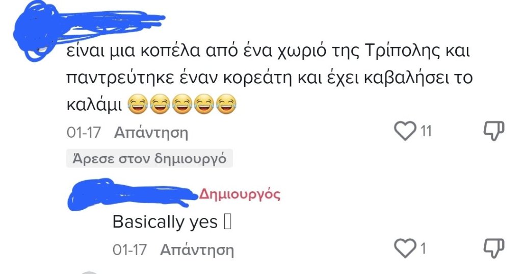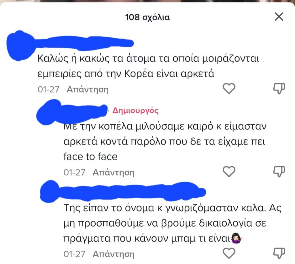 Ξέρετε τι μου ειπε;;; ότι της το είχε ζητήσει μια άλλη κοπέλα να το κάνει ώστε να μαζευτούν πολλές και να έχω πολλά άσχημα σχόλια (Για ποιον λόγο; Το αφήνω στην δική σας κρίση) Μίλησα μαζί της κάποιες μέρες για αυτό το συμβάν και για το άλλο πρόσωπο που της ζητούσε να τα κάνει όλα αυτά (βούληση στο φουλ) καθώς και λιγο για την ζωή στην Κορέα, ουσιαστικά μιλήσαμε 2~3 ημέρες και μετά αυτή η κοπέλα εξαφανίστηκε. Κάποια στιγμή μου είπε μια φίλη ότι η κοπέλα αυτή είπε πως έκανε μπλοκ κάποιο άτομο από το ινσταγκραμ γιατί της αντιγράφουν τα βίντεο και λέω εγω, αποκλείεται να εννοεί εμένα μιας και κάνω βίντεο 1 χρόνο παραπάνω από αυτή την κοπέλα και μάλιστα της πρότεινα και τις εφαρμογές που χρησιμοποιουσα εγώ για τα βίντεο της 🤷‍♀️