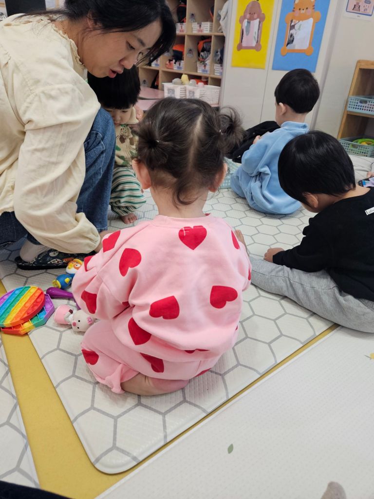 Η τάξη της έχει δεκαπέντε παιδάκια συνολικά και μέσα υπάρχουν τρεις δασκάλες, ενώ συνήθως υπάρχουν και μία με δύο βοηθοί. Κάθε δασκάλα είναι υπεύθυνη περίπου για πέντε παιδιά, οπότε η αναλογία είναι αρκετά καλή και φαίνεται ότι τα προσέχουν πολύ.